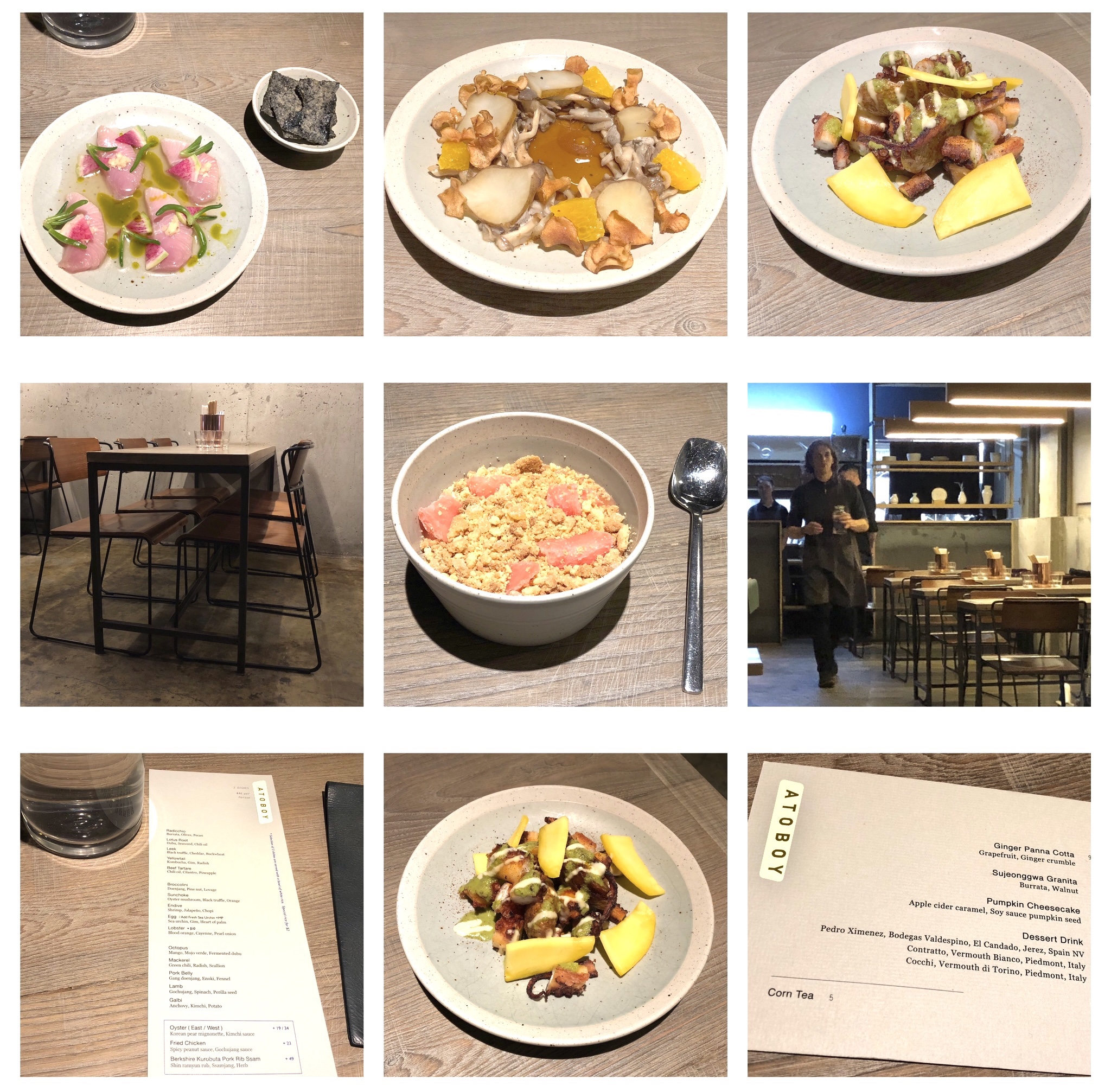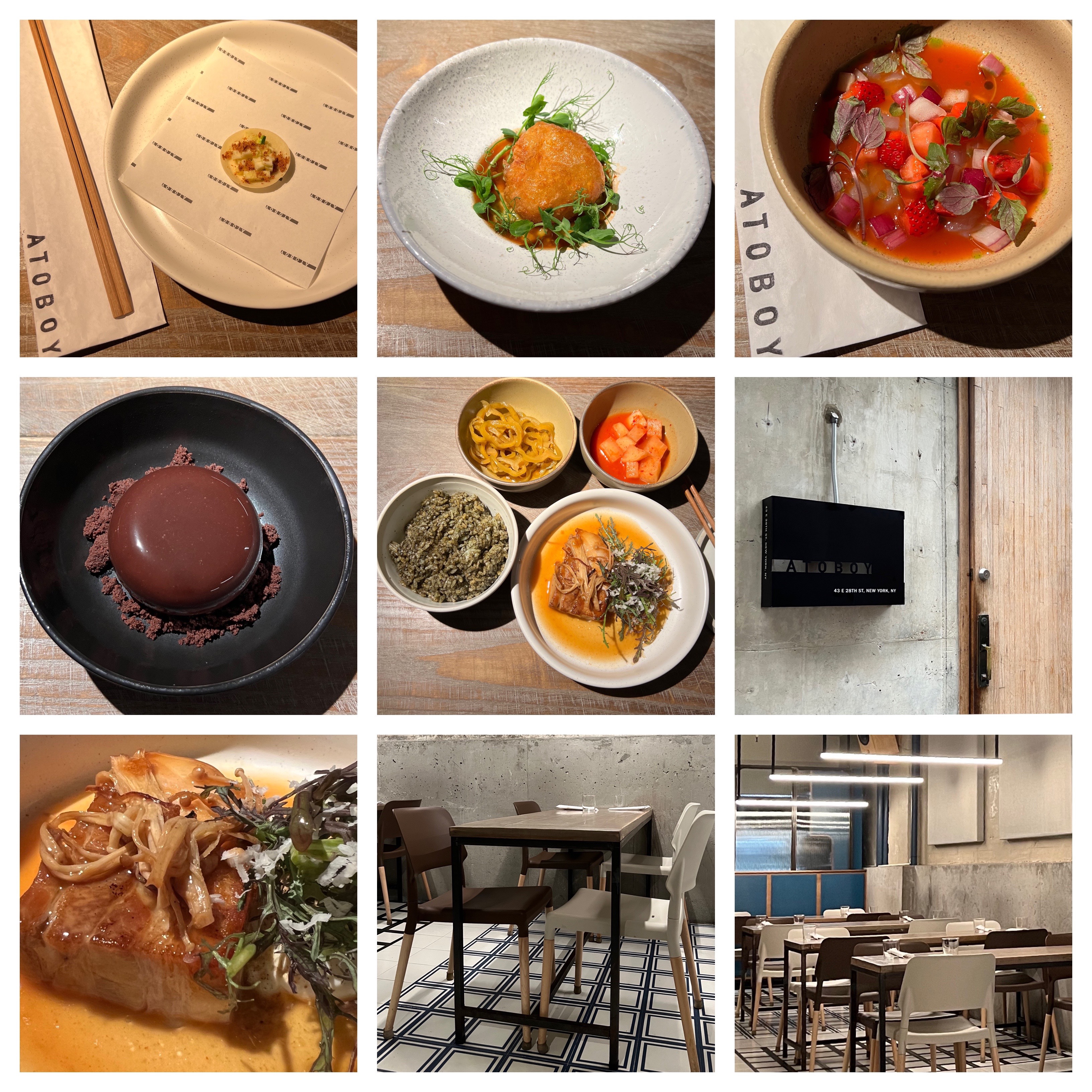 Atoboy : une déco underground, bois, fer, céramiques dans l’air du temps et les compositions de bistronomie coréenne du chef Junghyun Park qui a ouvert ce restaurant avec son épouse Ellia. Les prix sont très raisonnables pour NYC, les codes sont vraiment ceux de la cuisine d’auteur. Le chef a grandi à Séoul, parcouru le monde et ses cuisines, pour poser ses valises comme chef de cuisine dans l’étoilé coréen Jungsik à NYC, avant de se lancer dans sa propre aventure. Première assiette : yellowtail, kombucha, gim, radish, ultra fraîche et vivifiante, incroyablement équilibrée entre les cinq registres de saveurs dont l’umami. Deuxième assiette : sunchokes, oyster mushrooms, black truffle, orange, excellente! Troisième assiette : octopus, mango, mojo verde, fermented dubu. En dessert étonnante pannacotta gingembre, pamplemousse et crumble. Un autre dîner avec tartlet yukpo, summer squash, dubu-ricotta mousse suivi d’une entrée fluke, strawberry, mulhwe, shiso puis de shrimp Mandu foie gras, corn, lobster broth et de pork belly, enoki, potato, horseradish avant un dessert injeolmi mousse, rice cake, soybean, cocoa crumble, toujours aussi réjouissant ! Atoboy Site web